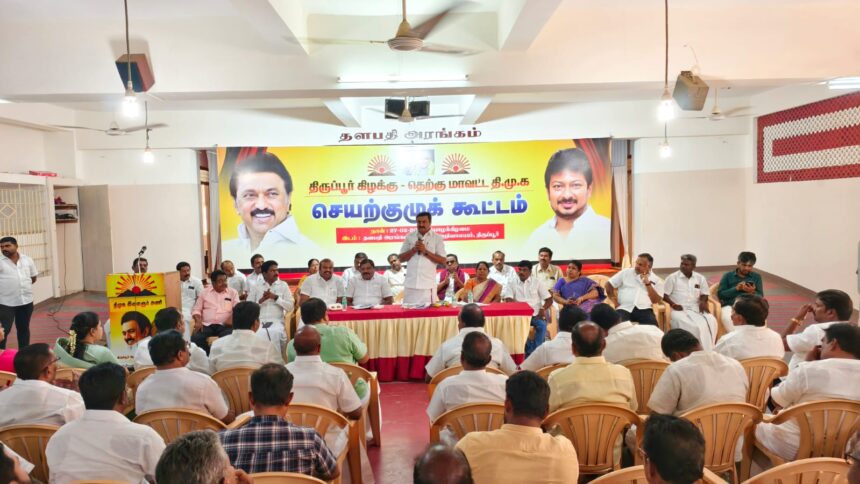 திருப்பூர் கிழக்கு மற்றும் தெற்கு மாவட்ட திமுக செயற்குழு கூட்டம் தாராபுரம் சாலையில் உள்ள கலைஞர் அறிவாலயத்தில் நடைபெற்றது. கூட்டத்திற்கு கிழக்கு மாவட்ட பொறுப்பாளர் மாண்புமிகு செய்தி மற்றும் தமிழ் வளர்ச்சி துறை அமைச்சர் மு.பெ. சாமிநாதன் தலைமை தாங்கி பல்வேறு ஆலோசனைகளை வழங்கினார். உடன் மாநில மகளிர் அணி துணைச் செயலாளர் மனித வள வேளாண்மை துறை அமைச்சர் கயல்விழி செல்வராஜ். தெற்கு மாவட்ட திமுக செயலாளர் மாநகராட்சி 4=வது மண்டல தலைவர் இல பத்மநாதன்.