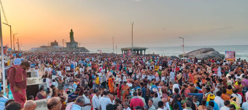 கன்னியாகுமரி திரிவேணி சங்கமத்தில் குமரி மற்றும் கேரளாவை சேர்ந்த பக்தர்கள் முன்னோர்களை நினைத்து எள்ளும், தண்ணீரும் தர்ப்பணம் செய்தனர்.