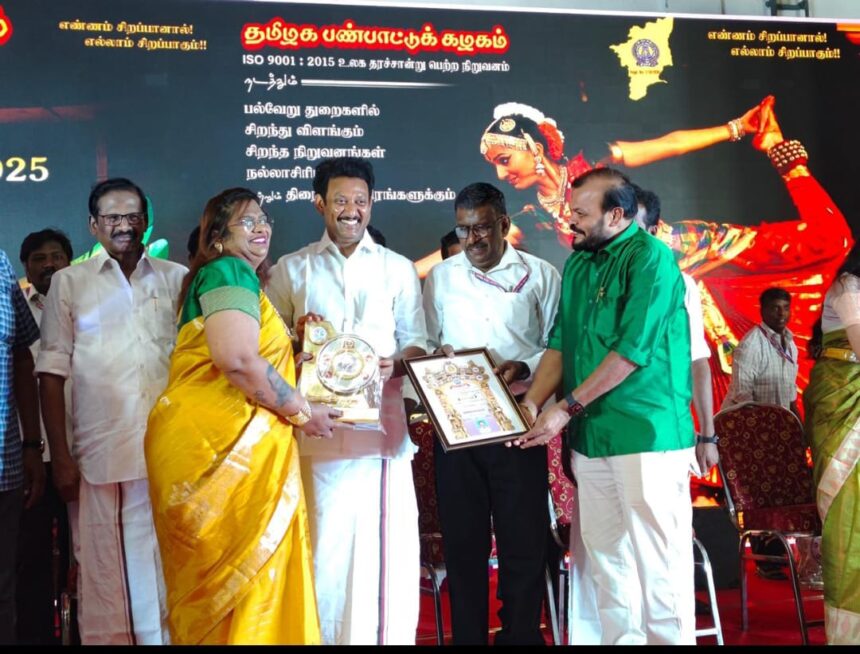 தமிழக பண்பாட்டுக் கழகம் சார்பில் பல்வேறு துறைகளில் சிறப்பாக பணியாற்றி வருபவர்களை பாராட்டி விருது வழங்கும் நிகழ்ச்சி திருச்சியில் நடைபெற்றது. இதில் திருப்பூர் இந்திரா சுந்தரம் தொண்டு நிறுவனத்தின் நிறுவனத் தலைவர் இந்திரா சுந்தரத்தின் சிறந்த சமூக சேவையை பாராட்டி ராஜ கலைஞன் விருது மற்றும் தங்கப்பதக்கம் சான்றிதழ் வழங்கப்பட்டது. இந்த விருதை தமிழ்நாடு பள்ளி கல்வித்துறை அமைச்சர் அன்பில் மகேஷ் பொய்யாமொழி வழங்கினார். இதில் தமிழக பண்பாட்டுக் கழகத் தலைவர் ஜாகிர் உசேன் செயலாளர் முத்துமாணிக்கம் பொருளாளர் ஜேசு பால்ராஜ் இந்திராசுந்தரம் தொண்டு நிறுவன செயலாளர் ராஜா முகமது உள்பட பலர் கலந்து கொண்டனர்.