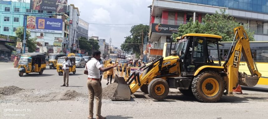 மதுரை காளவாசல் போக்குவரத்து சிக்னல் பகுதியில் குண்டும் குழியுமாக இருந்த சாலைகளை சீரமைத்த போக்குவரத்து காவலர்கள்