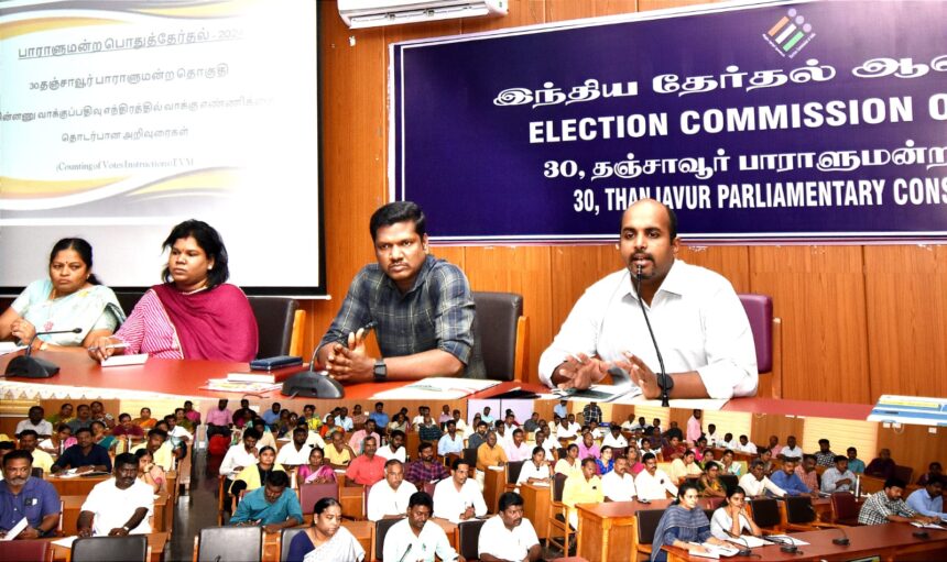தஞ்சாவூர் மாவட்டஆட்சித் தலைவர் அலுவலக கூட்டரங்கில் மக்களவை பொதுத் தேர்தலை முன்னிட்டு வாக்கு எண்ணிக்கை மையத்தில் பணிபுரியும் அலுவலர்களுக்கு மின்னணு வாக்குப்பதிவு இயந்திரங்களில் வாக்கு எண்ணிக்கை கையாள்வது குறித்து பயிற்சி வகுப்பும், வாக்கு எண்ணிக்கை மையத்தில் வாக்கு எண்ணும் பணியினை மேற் கொள்ள ஏதுவாக அலுவலர்களை நியமனம் செய்திட குலுக்கள் முறையிலான முதல் தேர்வு மாவட்ட தேர்தல் நடத்தும் அலுவலரும், மாவட்ட ஆட்சித் தலைவருமான தீபக் ஜேக்கப் தலைமையில் நடந்தது.