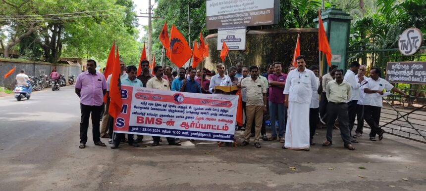 கன்னியாகுமரி மாவட்டம் நாகர்கோவில் அரசு போக்குவரத்து கழக தலைமை பணிமனை முன்பு கன்னியாகுமரி மாவட்ட பாரதிய அரசு போக்குவரத்து தொழிலாளர் சங்கம் (பிஎம்எஸ்) சார்பில் சங்கத் தலைவர் நடேசன் தலைமையில் கண்டன ஆர்ப்பாட்டம் நடைபெற்றது .