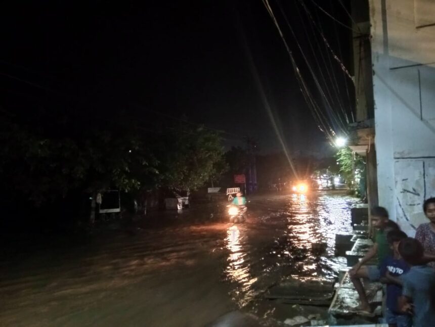 தேனி மாவட்டம் தேவாரம் பகுதியில் கடந்த மூன்று தினங்களாக மாலை வேலைகளில் தொடர்ச்சியாக கனமழை பெய்து வந்தது சனிக்கிழமை கனமழை சற்று அதிகமாக இருந்ததாலும் மேலும் தேவாரம் மலை அடிவாரப் பகுதியில் கனமழை பெய்ததன் காரணமாக  ஓடை வழியாக வெள்ளம் பெருக்கிட்டு பெருமாள்பட்டியில் இருந்து அழகர் நாயக்கன்பட்டி வரை தார் சாலை முழுவதும் காட்டாற்று வெள்ளம் சூழ்ந்து சைக்கிள் இருசக்கர வாகனத்தில் பயணித்தவர்களின் வாகனத்தை இழுத்துச் சென்றது அருகில் இருந்த பெருமாள்பட்டி பொதுமக்கள் லாவகமாக அவர்களை காப்பாற்றினர்.