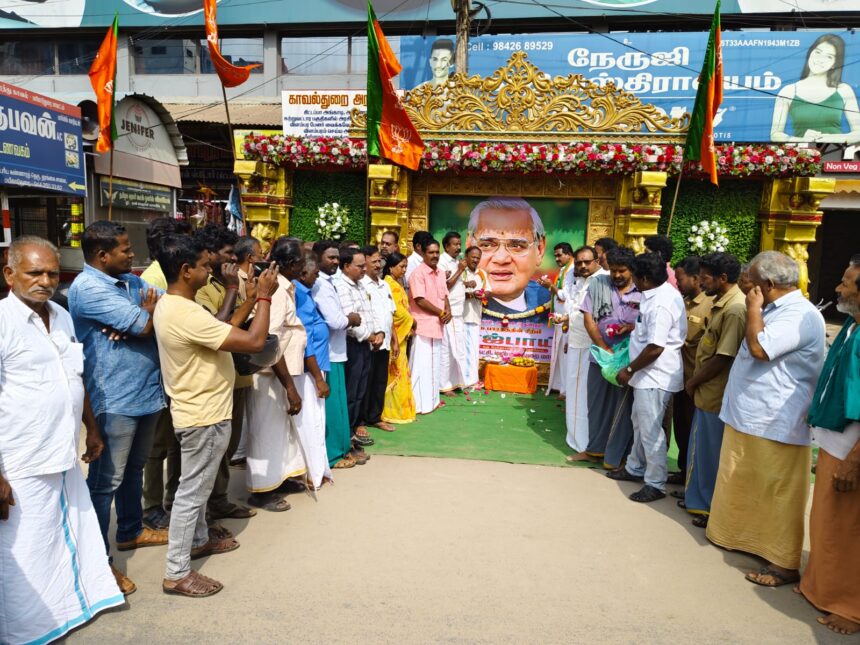 முன்னாள் பாரத பிரதமர் அடல் பிகாரி வாஜ்பாயியின் 100-வது பிறந்தநாள் விழா இன்று கொண்டாடப்பட்டு வருகிறது. இதை முன்னிட்டு மயிலாடுதுறையில் பாஜக சார்பில் கிட்டப்பா அங்காடி முன்பு அலங்கரித்து வைக்கப்பட்ட அடல் பிகாரி வாஜ்பாயின் உருவப்படத்திற்கு பாஜக மாவட்ட துணைத் தலைவர் மோடி.கண்ணன் தலைமையில் பாஜக நிர்வாகிகள் மலர் தூவி புகழஞ்சலி செலுத்தினர். தொடர்ந்து, பட்டாசு வெடித்து, பாதசாரிகள், வாகன ஓட்டிகளுக்கு இனிப்பு வழங்கிக் கொண்டாடினர். முன்னதாக, மயிலாடுதுறை தலைமை அஞ்சலகத்தில் மாவட்ட துணைத் தலைவர் மோடி.கண்ணன் முயற்சியால் மத்திய அரசின் பெண்குழந்தைகளுக்கான செல்வமகள் சேமிப்புத் திட்டத்தில் இதுவரை 4500 பயனாளிகள் சேர்க்கப்பட்டுள்ள நிலையில், வருமாண்டில் இதனை 10,000-ஆக உயர்த்த உறுதியேற்றுக்கொண்டு, ஏழ்மை நிலையில் உள்ள ஆட்டோ ஓட்டுநர்கள்  5 பேருக்கு முதல் தவணைத்தொகையான தலா ரூ.1000-த்தை செலுத்தி சேமிப்புத் திட்டத்தை தொடங்கி வழங்கினர். இதில் கோவி சேதுராமன், நாஞ்சில் பாலு,