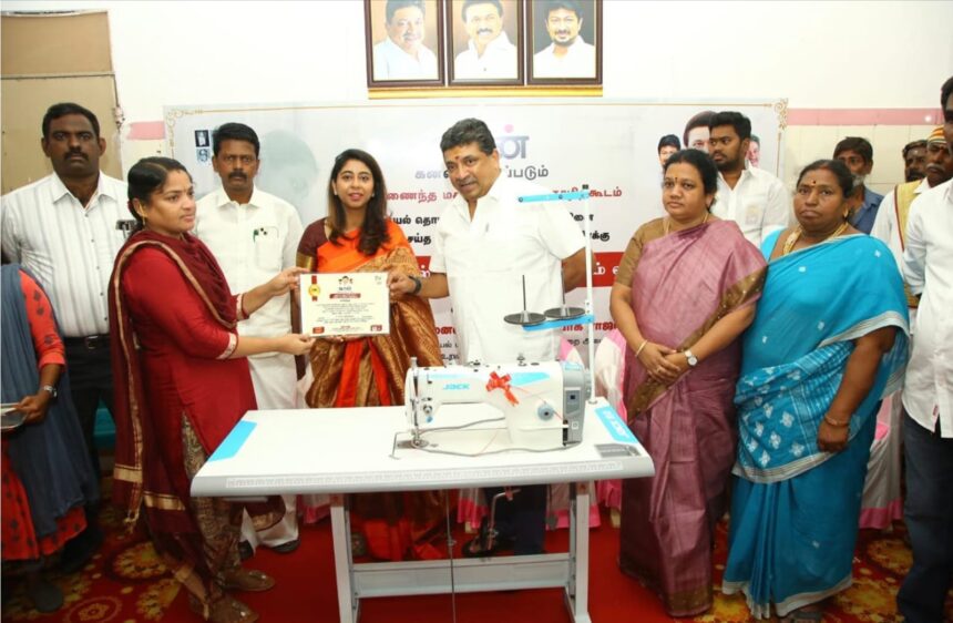 மதுரை மாநகராட்சி மகபூப்பாளையத்தில் வான் கனவு மெய்ப்படும் அமைப்பின் கீழ் தையல் தொழில் முனைவோர் பயிற்சியினை நிறைவு செய்த மகளிர்க்கு நவீன தையல் இயந்திரம் மற்றும் சான்றிதழை தகவல் தொழில் நுட்பவியல் மற்றும் டிஜிட்டல் சேவைகள் துறை அமைச்சர் முனைவர் பழனிவேல் தியாகராஜன் வழங்கினார்கள் அருகில் மேயர் இந்திராணி பொன்வசந்த், ஆணையாளர் ச.தினேஷ்குமார், துணை மேயர் தி.நாகராஜன், மண்டலத் தலைவர் பாண்டிச்செல்வி, ராஜ் மகால் பட்டு நிறுவன உரிமையாளர் சிவப்பிரியா, மாமன்ற உறுப்பினர் மகாலெட்சுமி ஆகியோர் உடன் உள்ளனர்.