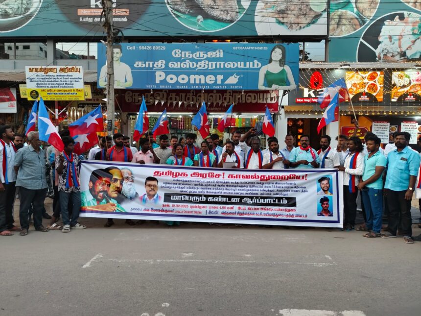 மயிலாடுதுறை மாவட்டம் முட்டம் கிராமத்தில் பிப்.14-ஆம் தேதி சாராய வியாபாரிகளால் படுகொலை செய்யப்பட்ட ஹரிஷ், ஹரிசக்தி ஆகிய இளைஞர்களுக்கு நீதி கேட்டும், அப்பகுதியில் தொடர்ச்சியாக சாராய விற்பனை செய்வது தெரிந்தும் எவ்வித நடவடிக்கையும் எடுக்காத பெரம்பூர் காவல்துறையை கண்டித்தும், சிவகங்கை மாவட்டத்தில் புல்லட் ஓட்டிய தலித் இளைஞரின்; கையை வெட்டிய கூலிப்படை கும்பலை கண்டித்தும் இந்த ஆர்ப்பாட்டம் நடைபெற்றது.