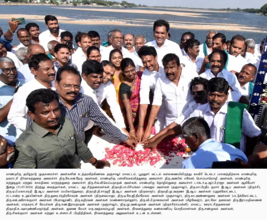 தஞ்சாவூர் மாவட்டம் கல்லணை யிலிருந்து டெல்டா பாசனத்திற் காக .தமிழக அமைச்சர்கள் நகராட்சியின் நிர்வாக துறை அமைச்சர் கே என் நேரு பள்ளி கல்வித்துறை அமைச்சர் அன்பில் மகேஷ் பொய்யா மொழி சுற்றுச்சூழல் மற்றும் காலநிலை மாற்றத்துறை அமைச்சர் சிவ வி மெய்ய நாதன் தொழில்துறை அமைச்சர் டி ஆர் பி ராஜா ஆகியோர் தண்ணீர் திறந்து வைத்தனர்.