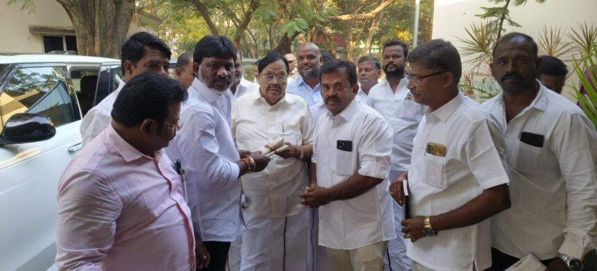 கழக பொதுச் செயலாளர் நீர்வளத்துறை அமைச்சர் துரைமுருகனை புதியதாக தேர்ந்தெடுக்கப்பட்ட கிருஷ்ணகிரி திமுக மேற்கு நகர பொறுப்பாளர்  என்.அஸ்லம் கிருஷ்ணகிரி கிழக்கு நகர பொறுப்பாளர்