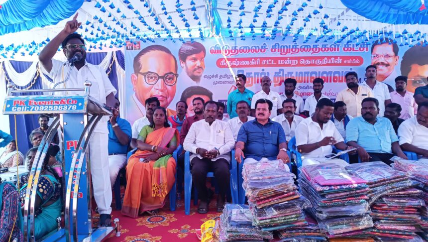 கிருஷ்ணகிரியில் விடுதலை சிறுத்தைகள் கட்சியின் தலைவர் திருமாவளவன் பிறந்த நாளை முன்னிட்டு ஏழை எளிய மக்களுக்கு நலத்திட்ட உதவிகள் வழங்கப்பட்டது. கிருஷ்ணகிரி புதிய பேருந்து நிலையம் அருகே உள்ள அண்ணா சிலை எதிரில் விடுதலை சிறுத்தைகள் கட்சியில் கிருஷ்ணகிரி சட்டமன்ற தொகுதியின் சார்பில் தலைவர் தொல். திருமாவளவன் பிறந்தநாள் விழா கொண்டாடப்பட்டது. இந்த விழாவிற்கு கிருஷ்ணகிரி சட்டமன்ற தொகுதி செயலாளர் தியாகு தலைமை வகித்தார். கிருஷ்ணகிரி கிழக்கு ஒன்றிய செயலாளர் மாதையன் வரவேற்புரை ஆற்றினார். மண்டல துணைச் செயலாளர் மின்னல் சக்தி மாவட்ட பொருளாளர் முனிராவ், மாவட்ட துணைச் செயலாளர் ராதாகிருஷ்ணன் ஆகியோர் முன்னிலை வகித்தனர்.