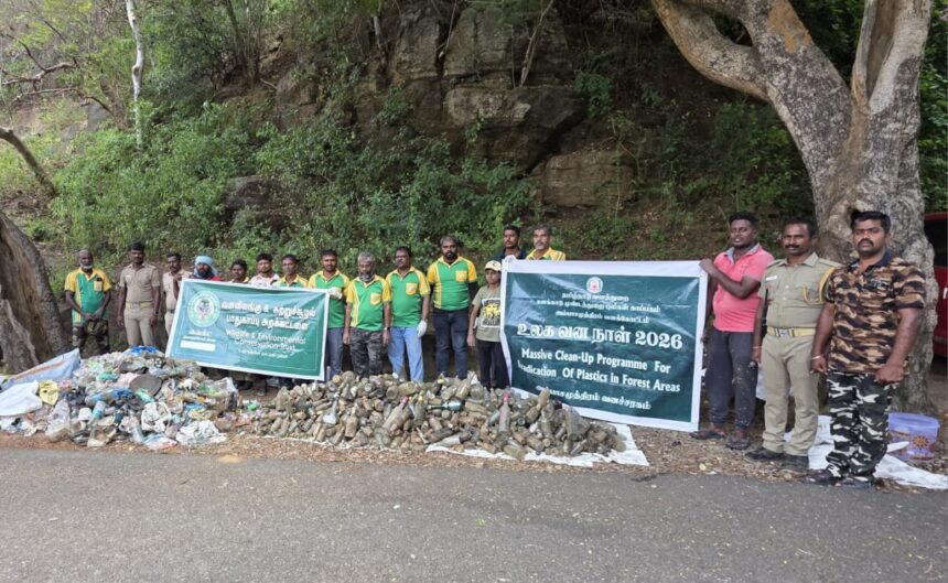 உலக வன நாள் தினத்தை முன்னிட்டு திருநெல்வேலி மாவட்டம், மேற்கு தொடர்ச்சி மலைப் பகுதியில் வன சுற்றுச்சூழலை பாதுகாக்கும் வகையில் அம்பாசமுத்திரம் புலிகள் காப்பக இணை இயக்குநரும், வன உயிரின காப்பாளருமான ஸ்ரீகாந்த் உத்தரவின் பெயரில் அம்பாசமுத்திரம் வனச் சரகர் கவின் தலைமையில் ஞாயிற்றுக்கிழமை (22.03.2026) அன்று மணிமுத்தாறு அணை வன பேச்சி அம்மன் கோயிலை சுற்றியுள்ள பகுதிகளில் வனவிலங்கு மற்றும் சுற்றுச்சூழல் பாதுகாப்பு அறக்கட்டளை சார்பில் திருநெல்வேலி மாவட்ட ஒருங்கிணைப்பாளர் ஜாபர் தலைமையிலான தன்னார்வலர்கள் வனப் பகுதியில் தூய்மைப்படுத்தும் பணியில் ஈடுபட்டனர். இதில் மது பிரியர்கள் விட்டுச் சென்ற 540 கிலோ காலி மது பாட்டில்கள் மற்றும் பொதுமக்கள் விட்டுச் சென்ற 260 கிலோ பிளாஸ்டிக் பொருட்களை ஒரே நாளில் கண்டெடுத்து அவற்றை அப்புறப்படுத்தினர். இந்தப் பணியின் போது குமரி, தென்காசி, தூத்துக்குடி மற்றும் நெல்லை மாவட்டத்தை சேர்ந்த தன்னார்வலர்கள் பாபு, சண்முகம், மாகின், ஜேம்ஸ், மாலிக், சங்கர், அய்யனார், சரவணகார்த்திக், பிரதீப், ஜெயன், பிரின்ஸ் உட்பட்ட சரக வன ஊழியர்கள் கலந்து கொண்டனர்.