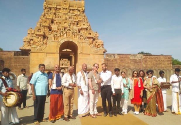 உலக சுற்றுலா தினத்தையொட்டி தஞ்சாவூர் பெரிய கோவிலில் மாவட்ட நிர்வாகம் மற்றும் தஞ்சாவூர் சுற்றுலா வளர்ச்சி குழுமம் சார்பில் கோவிலுக்கு வந்த சுற்றுலா பயணிகளை பாரம்பரிய முறைப்படி வரவேற்கும் நிகழ்ச்சி நடைபெற்றது