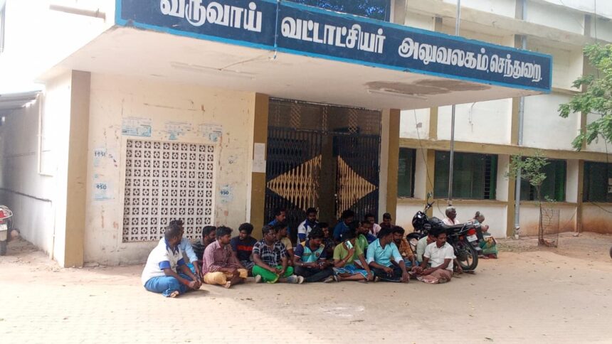 அரியலூர் மாவட்டம் செந்துறை வட்டம், வடக்கு இரும்புலிக்குறிச்சி கிராமத்தில் காரை குளம் உள்ளது இதில் அவ்வூர் மக்கள் பயன்படுத்தி வருகின்றனர்.இந்த ஏரியில் வண்டல் மண் எடுப்பதற்கு அரசாங்கம் அனுமதி அளித்திருந்த நிலையில் ஒரு ஜேசிபி இயந்திரம் கொண்டு மண் அல்லாமல் 7 ,8 ஜேசிபி இயந்திரங்கள் கொண்டு மிகவும் ஆழமாக வண்டல் மண் எடுப்பதாக வடக்கு இரும்பிலிகுறிச்சி இளைஞர்கள் மத்தியில் குற்றச்சாட்டு இதனால் இளைஞர்கள் வெகுண்டு எழுந்து செந்துறை தாலுக்கா அலுவலகம் முன்பு முற்றுகை போராட்டத்தில் ஈடுபட்டனர்.அப்பொழுது அங்கு வந்த காவல்துறை மற்றும் அதிகாரிகள் பேச்சுவார்த்தையில் ஈடுப்பட்டனர். இதில் அங்கு போராட்டத்தில் இருந்த இளைஞர்கள் ஒரு சில கோரிக்கை வைத்தனர் அதில் வடக்கு இரும்பிலிகுறிச்சி கிராமத்தில் அரசு துவக்கப்பள்ளி வளாகத்தில் விஷ ஜந்துக்கள் உலாவி வருவதால் சுற்றி சுற்றுச்சுவர் எழுப்ப வேண்டும், ஊருக்கு நியாய விலை கடை கட்டித்தர வேண்டும், இளைஞர்களுக்கு விளையாட்டு கூடம் அமைத்து தர வேண்டும், ஊரில் போதிய தண்ணீர் வசதி இல்லை ஏற்பாடு செய்ய வேண்டும்,ஊரில் தெரு விளக்குகள் தெரியாததால் போதிய வெளிச்சம் இல்லை இதனால் தெரு விளக்கு அமைத்து தர வேண்டும். உடனடியாக நடவடிக்கை எடுக்க வேண்டும் என கோரிக்கை வைத்து மனு அளித்தனர் அதனை பெற்றுகொண்ட அதிகாரி மேல் அதிகாரி தாசில்தாரிடம் மனுவினை அளித்து பரிசீலனை செய்து உரிய நடவடிக்கை எடுக்கப்படும் என கூறியதன் அடிப்படையில் அனைவரும் அங்கிருந்து கலைந்து சென்றனர்.
